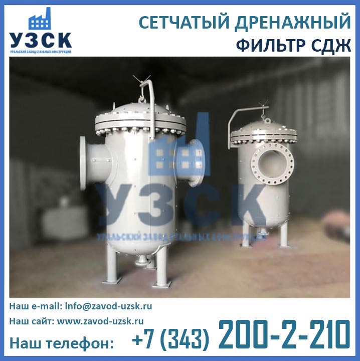 На формирование цены дренажного фильтра влияют следующие факторы: материальное исполнение, конструктивное исполнение, стоимость сырья в момент изготовления, комплектация, необходимость доставки в другой населенный пункт, срочность выполнения работ по изготовлению, прочие предпочтения заказчика. Уральский завод стальных конструкций изготавливает фильтры СДЖ-700 любого типового исполнения, а также нестандартные фильтры СДЖ 700 мм по чертежам заказчика или техническому заданию. Дополнительно к фильтрам СДЖ у нас Вы можете заказать сменные фильтрующие элементы любой тонкости фильтрации, ответные фланцы, прокладки и крепеж. По запросу изготавливаем также фильтры СДЖ-К-700 с концевым затвором. Для того чтобы узнать какова цена на фильтр СДЖ Ду700 в Нижневартовске с необходимыми Вам характеристиками, отправьте запрос в отдел продаж завода УЗСК по координатам, указанным в разделе «Контакты».