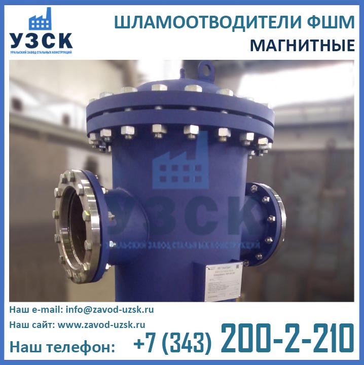 Шламоотводитель ФШМ 800 (шламоуловитель ФШМ-800, шламоотделитель ФШМ-800) представляет собой сетчатый магнитный фильтр, предназначенный для очистки воды и иных неагрессивных жидкостей от ферромагнетиков, шлама, ила, песка, а также прочих посторонних частиц и примесей.